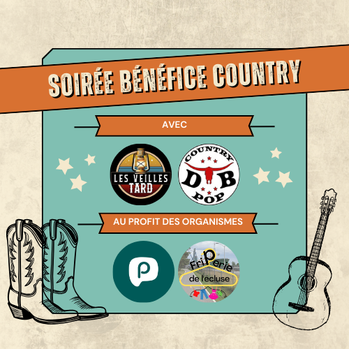 Le samedi 31 janvier 2026, sort ton chapeau et tes bottes de cowboy et vient faire le party avec le groupe Les Veilles Tard et de la danse country ! Tu pourras chanter et danser sur les plus grands classiques des répertoires, country, rock, québécois et pop. En plus, c’est pour 2 bonnes causes!